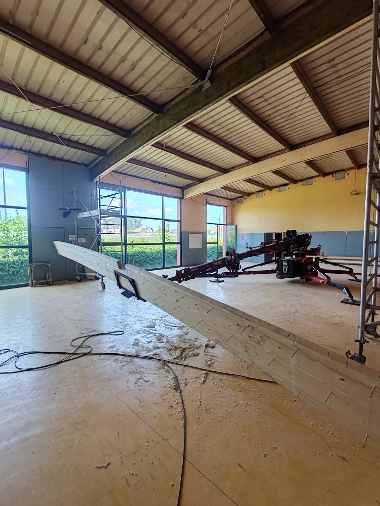 L’une des particularités majeures de ce chantier à Buchy (76) réside dans la méthode de levage par le dessous, rarement utilisée pour des éléments de charpente bois lamellé-collé.